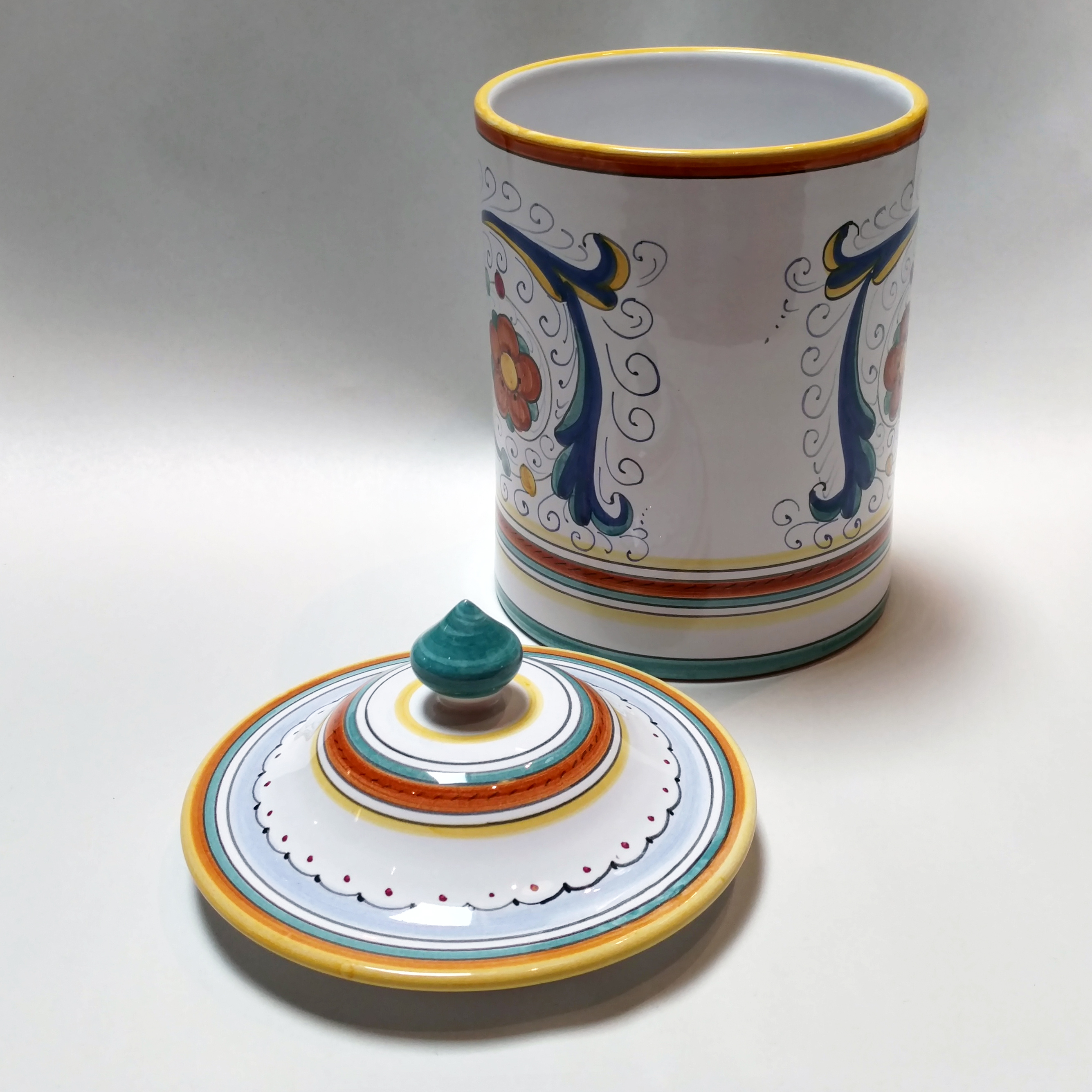 Farina means flour in Italian; keep yours easily accessible in this beautiful hand painted canister, made in Deruta. The classic Ricco design will be a welcome addition to your kitchen counter. Mix and match with the Raffaellesco canisters to create your perfect canister set.