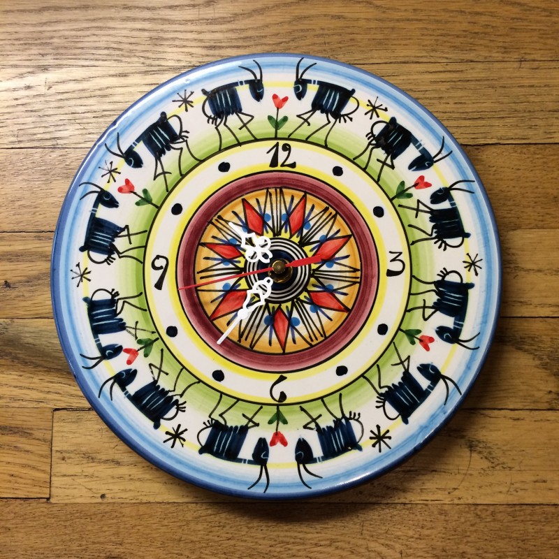 The ceramic wall clock is an enchanting piece that blends functionality with whimsical art. Its face is adorned with delightful hand-painted goat motifs, surrounded by a vibrant ring of geometric patterns in bright colors. The goats, depicted in a playful style, encircle the clock face alongside tiny red hearts, adding a touch of warmth and humor. The center features bold and intricate geometric designs, drawing attention with their lively colors. Framed by a soft blue border, this clock is both a timepiece and a lively decorative element, bringing joy and artistic flair to any room it graces.