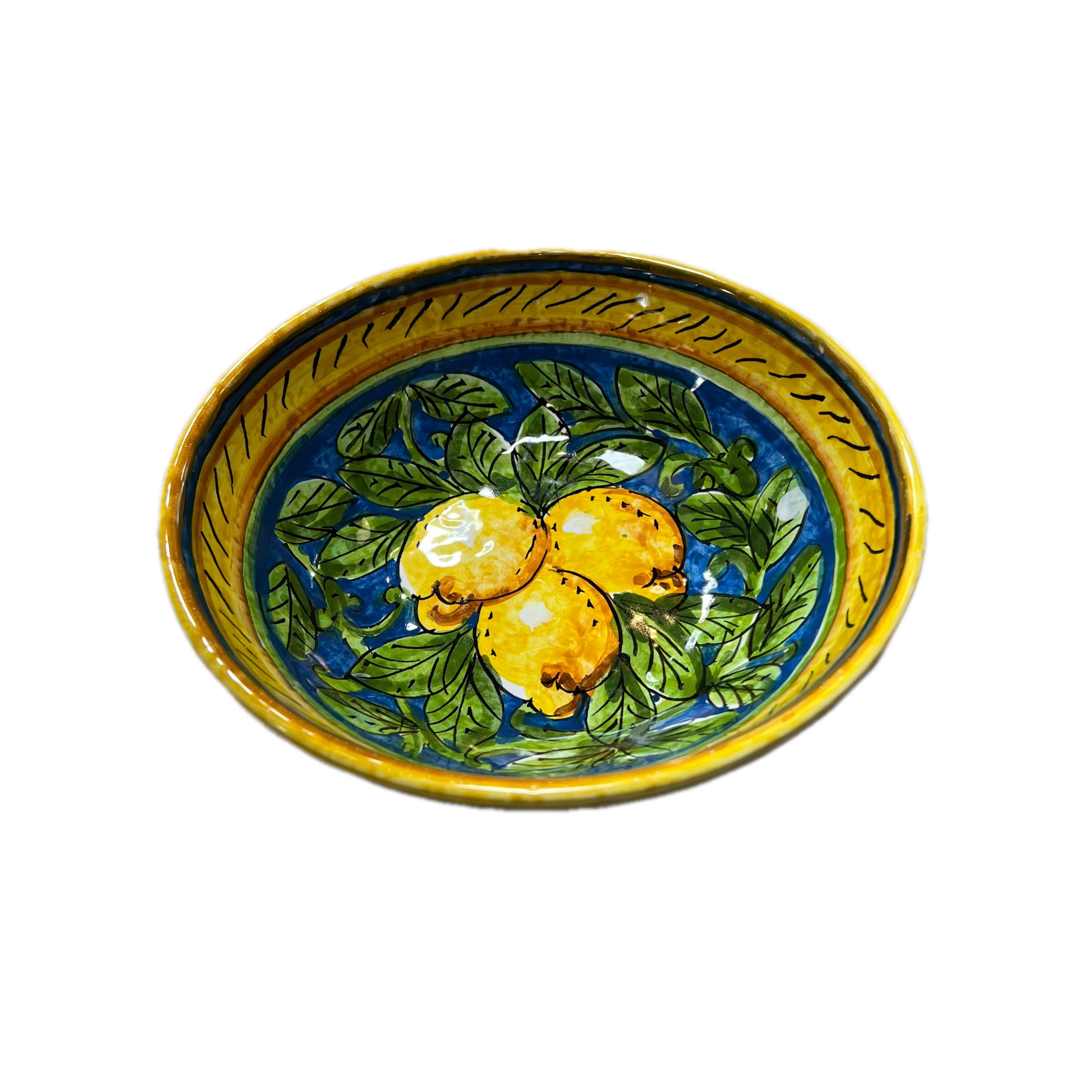 Lemons are a central motif in Italian ceramics, and our Limone collection, with its bright lemons and leaves on a blue background, is a shining example. These handmade, hand painted ceramics come from the Umbria region in Italy.