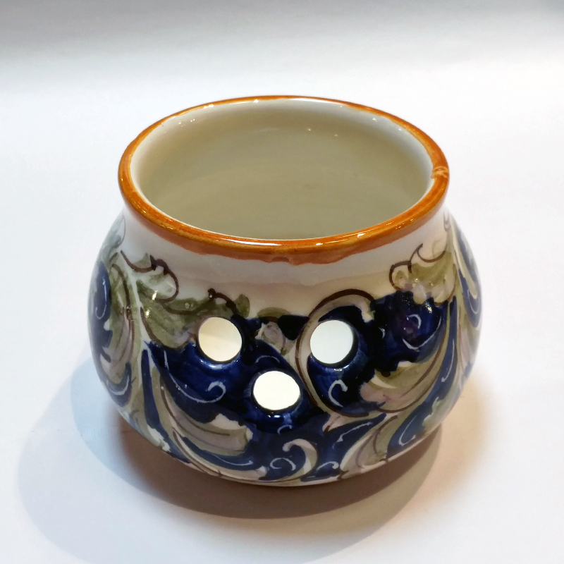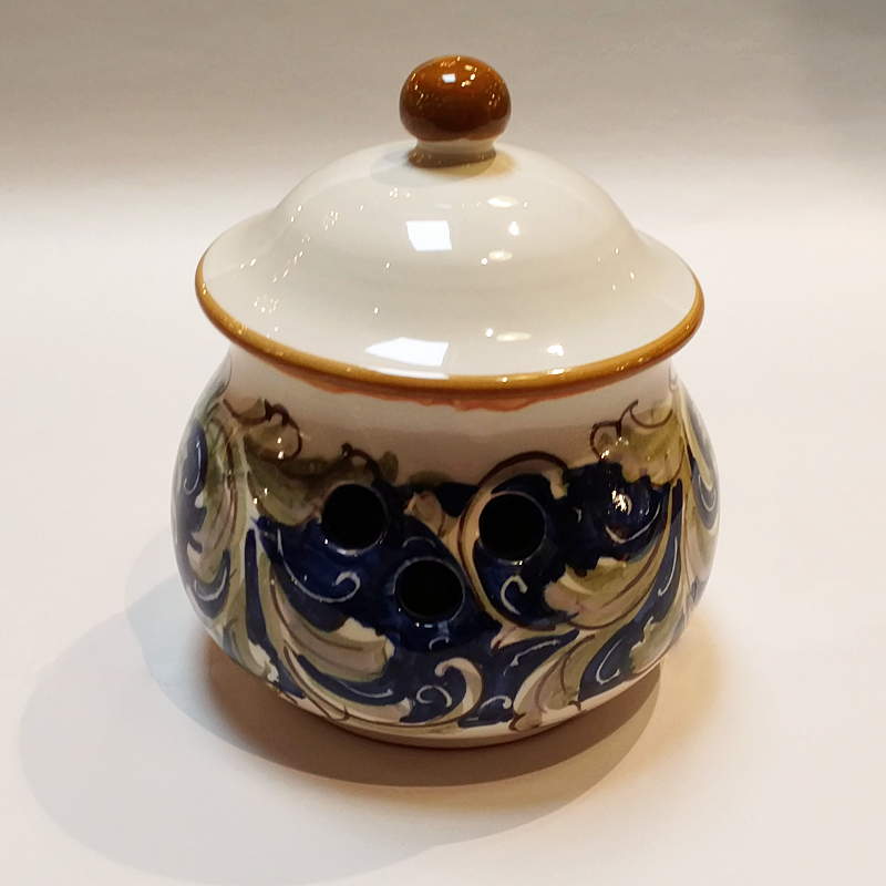 Volute, named for the classical scroll-work that comprises this opulent design, adds an elegant touch to your home with its luxurious colors and painterly spirit. The graceful curves of the warm, grey-green scrolls set on a cobalt background would be enough to please even the most discerning of Italophiles, but the bright lemons and sweet lemon flowers really seal the deal. Stash your garlic in style with this beautiful garlic keeper.