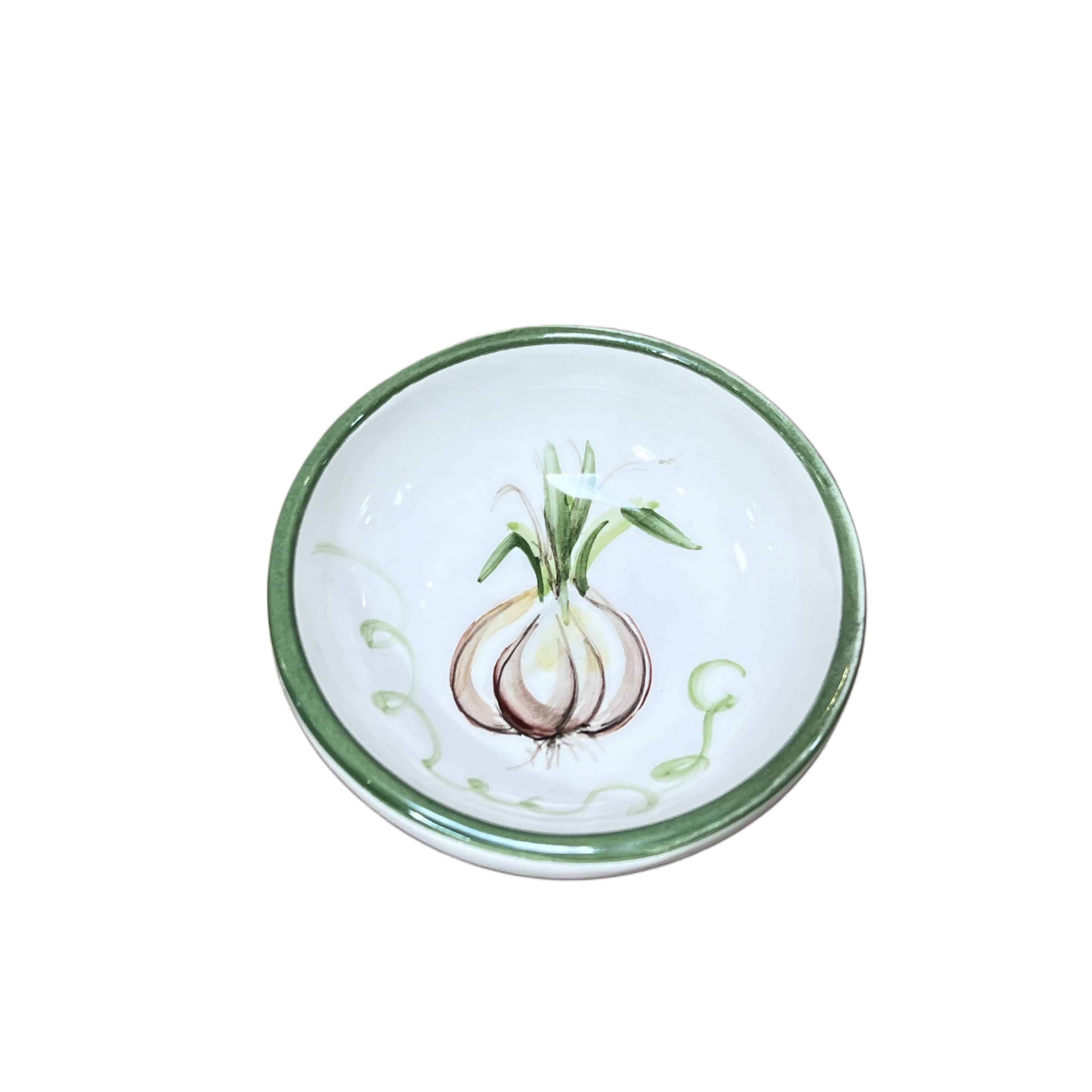 Simple and modern elegance in a traditional shape. This piece features a singular hand painted garlic on a white background with green detailing.