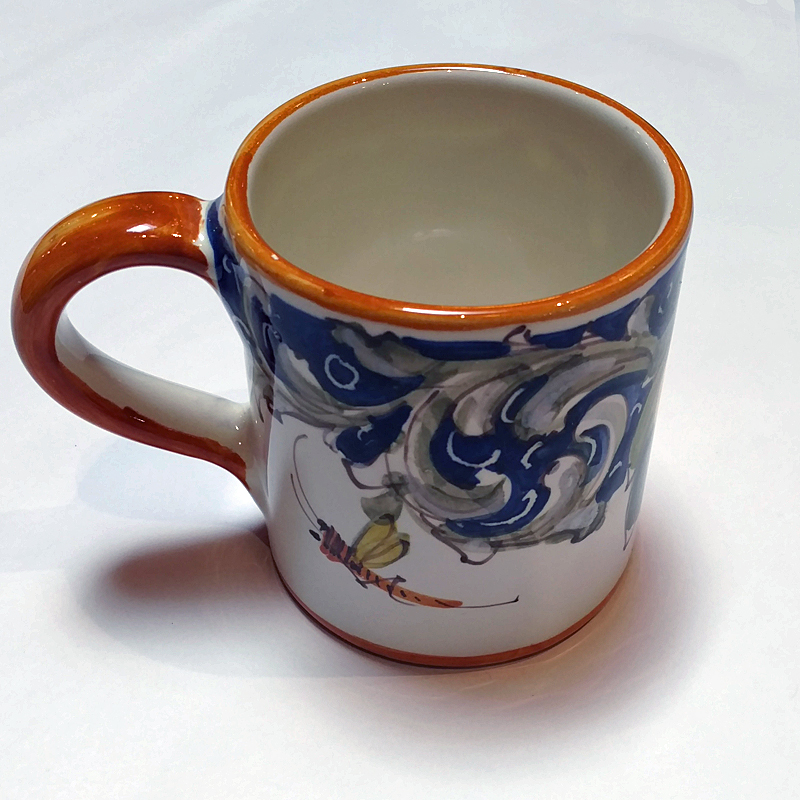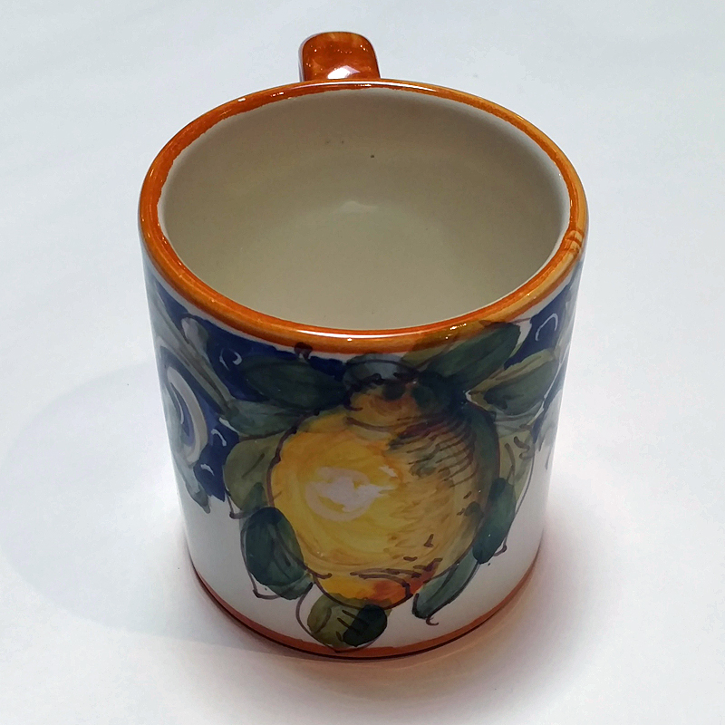 Volute, named for the classical scroll-work that comprises this opulent design, adds an elegant touch to your home with its luxurious colors and painterly spirit. The graceful curves of the warm, grey-green scrolls set on a cobalt background would be enough to please even the most discerning of Italophiles, but the bright lemons and sweet lemon flowers really seal the deal. Sipping your morning coffee or tea (or wine, who are we to judge?) from this beautifully handmade mug is the best way to start your day.