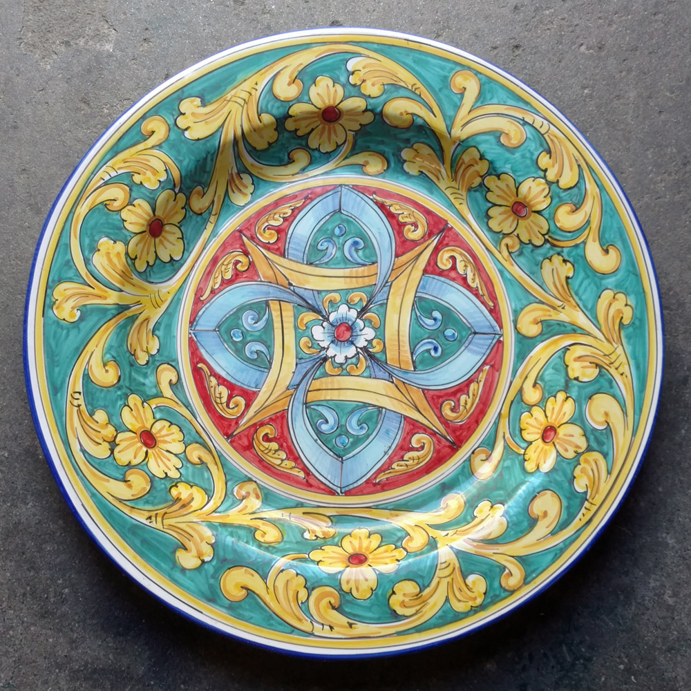 This beautiful platter, handmade and hand painted in Sicily, is the perfect decorative accent to hang on your wall. Either hung alone or among other platters and art pieces in a “gallery wall”-type arrangement, this incredible work of art is sure to make a statement in your home; but if you would rather use it for serving, rest easy – it’s food safe, too!