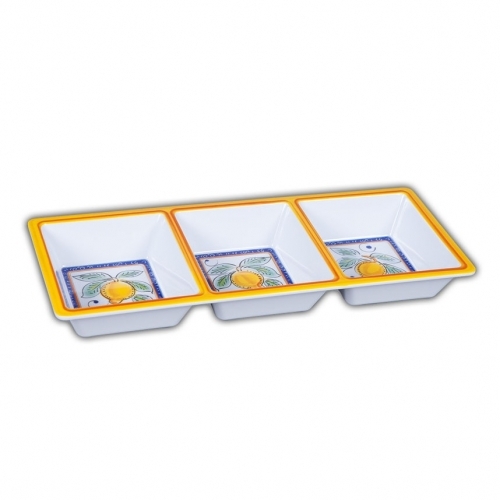 This beautiful Melamine three-part dish is a great addition to your outdoor dining collection. Featuring a classic Italian lemon motif, this high-quality, deluxe melamine collection looks just like the real thing – and it’s dishwasher safe! Add this piece to an existing Alcantara collection or start a new collection for outdoor dining! Note: Melamine is high-quality, heavy-duty plastic.