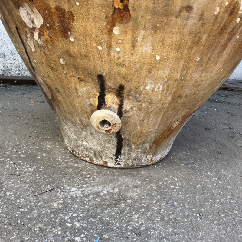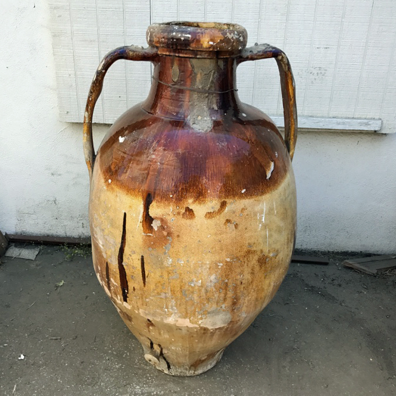 This antique giara (large urn) is at least 100 years old and comes from Puglia in Southern Italy. These urns (giare is the plural!) were made by hand on a potter’s wheel and were used to store wine. A plate was cemented over the top to ensure that the wine did not sour. After all of the wine was drawn from the spigot, the cemented plate was broken off and the giara was reused.