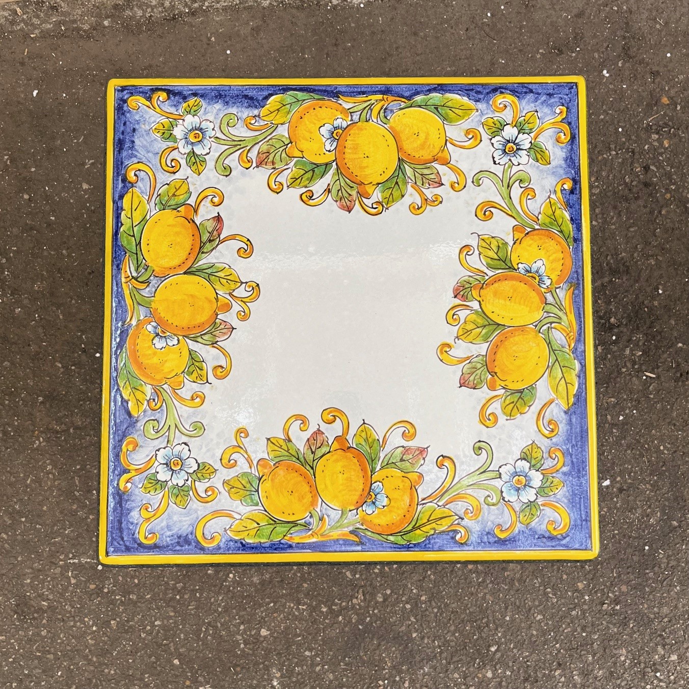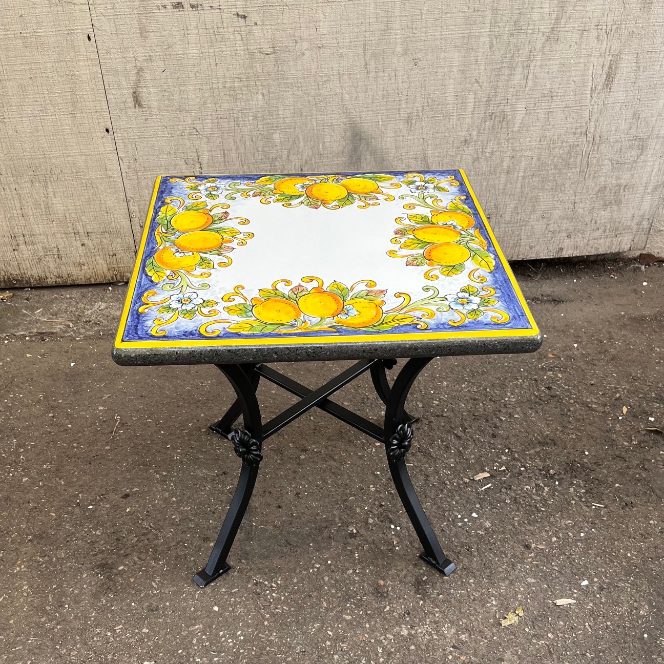 Italian Volcanic Outdoor Table with Iron Base – Lemons on a blue background. This beautiful and virtually indestructible volcanic aggregate table is harder than granite, is all-weather safe and made to last a lifetime. Expert Italian artisans transform the carved volcanic stone using the same skills developed during centuries of fine ceramic artistry – but these high-fired tables are NOT CERAMIC! They are made to be left outside year ’round – rain, snow or shine – with no impact on the finish! They are harder than granite, yet feature the intricate glaze work that has made Italian ceramics famous for centuries. These tables are tough and made to withstand all types of harsh weather, but they look great inside too!