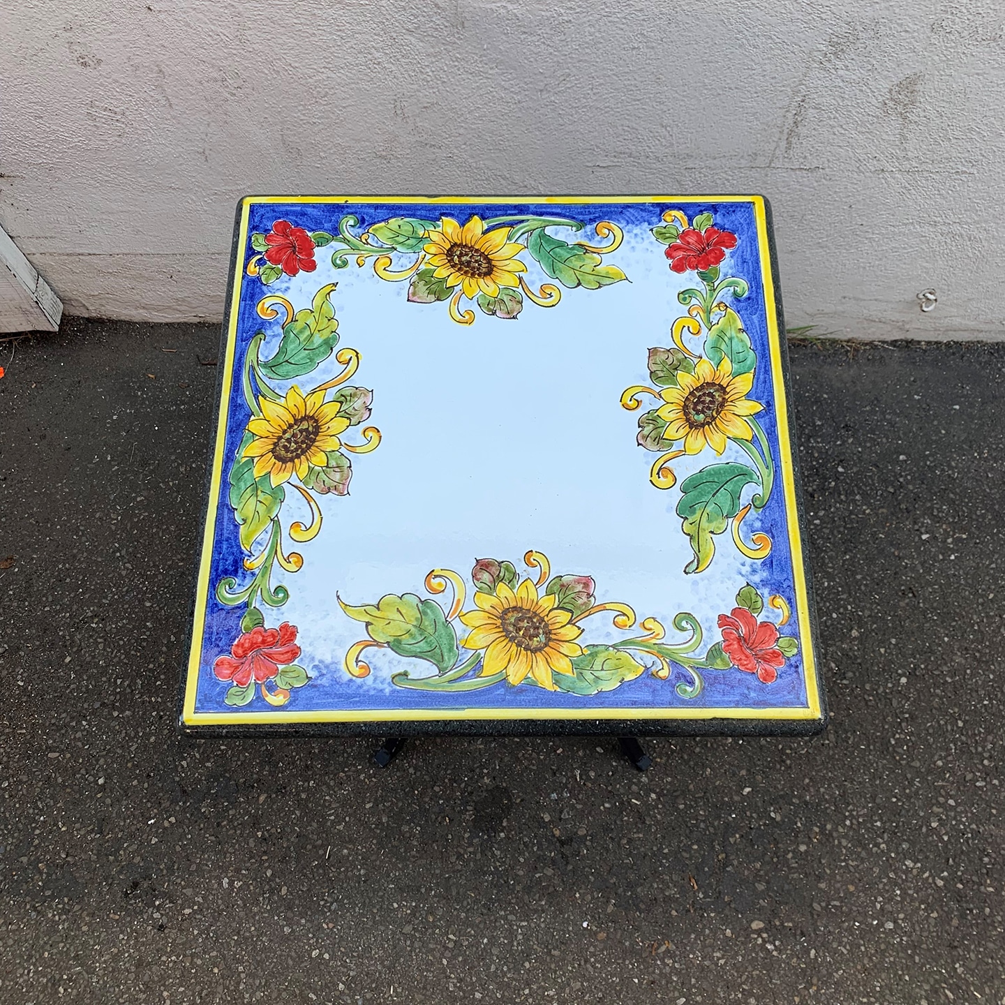 Italian Volcanic Outdoor Coffee Table with Iron Base – Sunflowers and Poppies on white background. This beautiful and virtually indestructible volcanic table is harder than granite, is all-weather and made to last a lifetime. These tables are tough and made to last lifetimes in harsh weather, but they look great inside too.